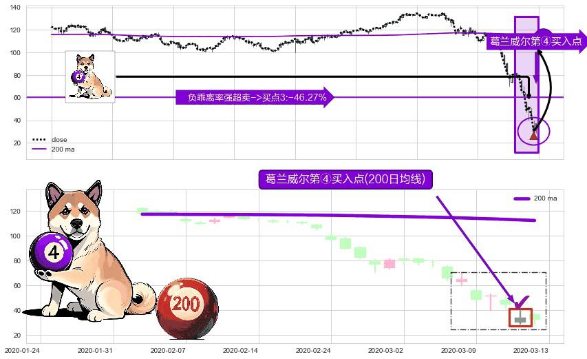 形态多维评估: ⚀ 2020-03-12-日显现 葛兰威尔均线 200日均线 第④买入点 下降趋势均值回复的短线反弹信号,后市看涨,买进信号