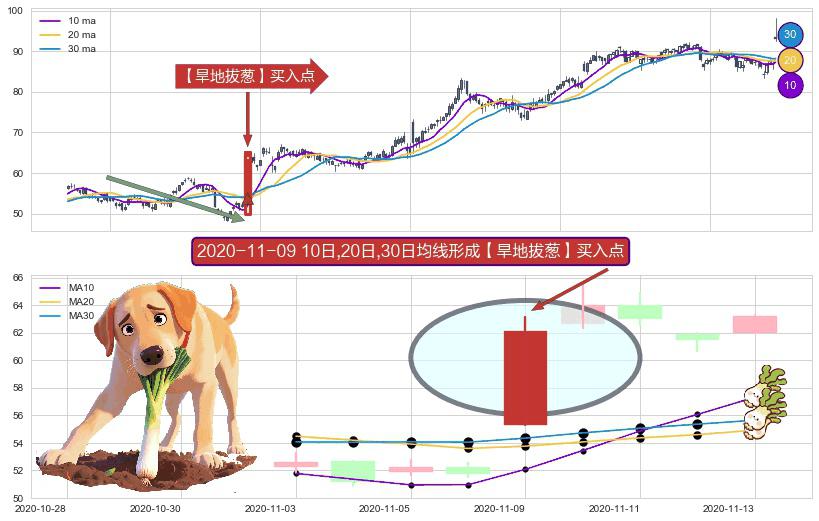 ⚀ 2020-11-09日显现 10日-20日-30日均线 【旱地拔葱】买入点 看多信号,后市看涨,买入