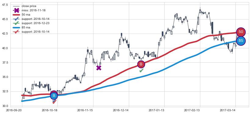 上涨趋势2016-09-20-2017-03-15,均线50, 85确认关键支撑2处