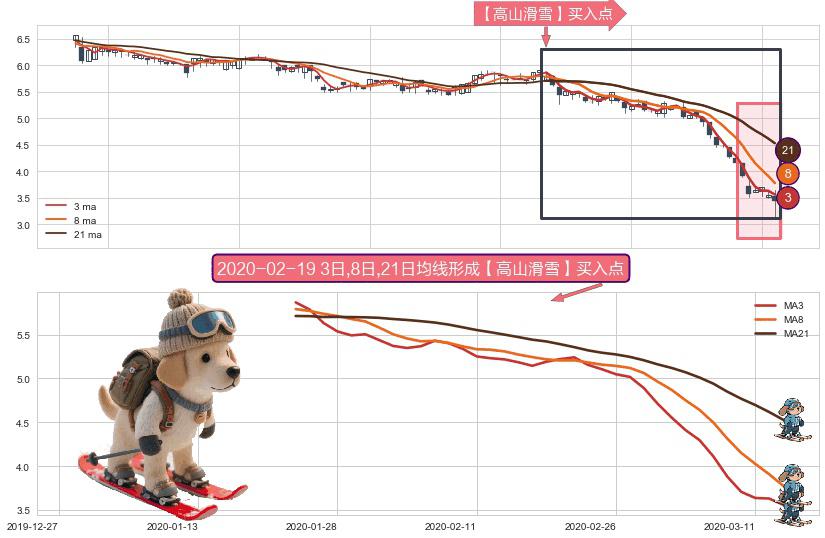 形态多维评估: ⚀ 2020-01-23日-2020-03-13日显现 3日-8日-21日均线 【高山滑雪】买入点 看多信号,后市看涨,买入
