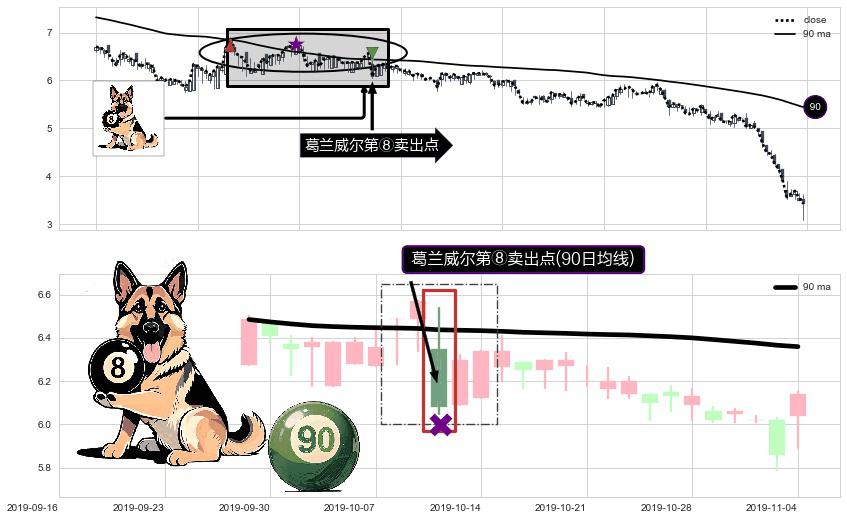形态多维评估: ⚀ 2019-10-10-日显现 葛兰威尔均线 90日均线 第⑧卖出点 下降趋势的中继信号,后市看跌,卖出信号
