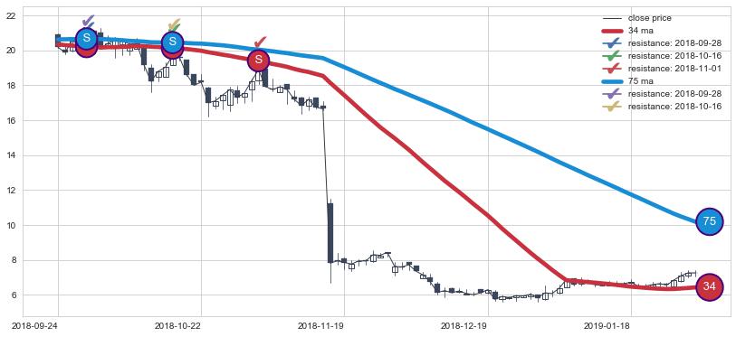 下跌趋势2018-09-24-2019-02-01,均线34, 75确认关键阻力3处