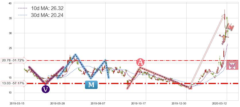 ♘ 支撑价格位20.78,可信任强度46.51%,距离最后交易2020-03-13形成的收盘价格30.43相差 -31.72%