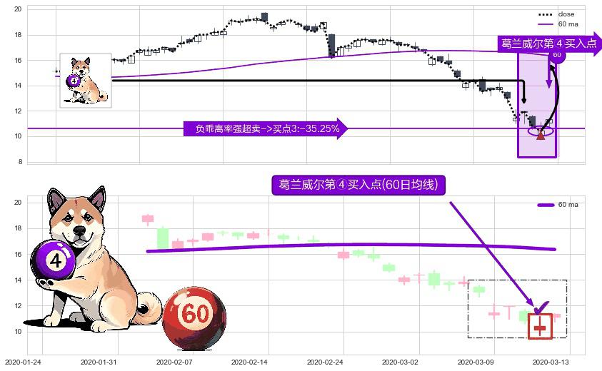 形态多维评估: ⚀ 2020-03-12-日显现 葛兰威尔均线 60日均线 第④买入点 下降趋势均值回复的短线反弹信号,后市看涨,买进信号