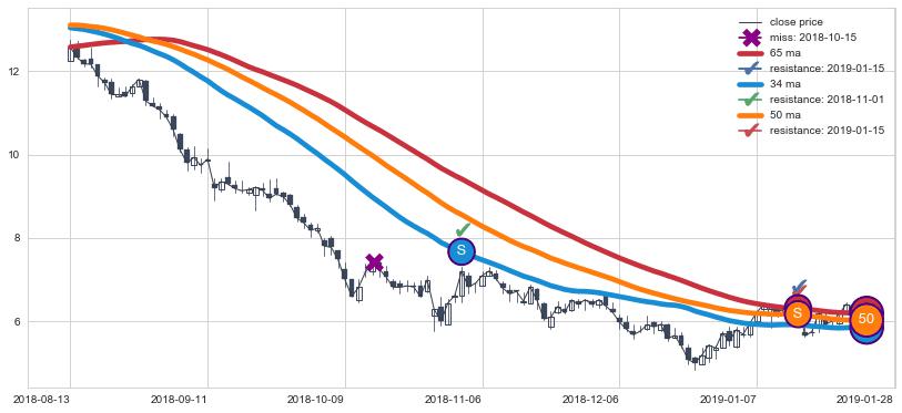 下跌趋势2018-08-13-2019-01-28,均线65, 34, 50确认关键阻力2处