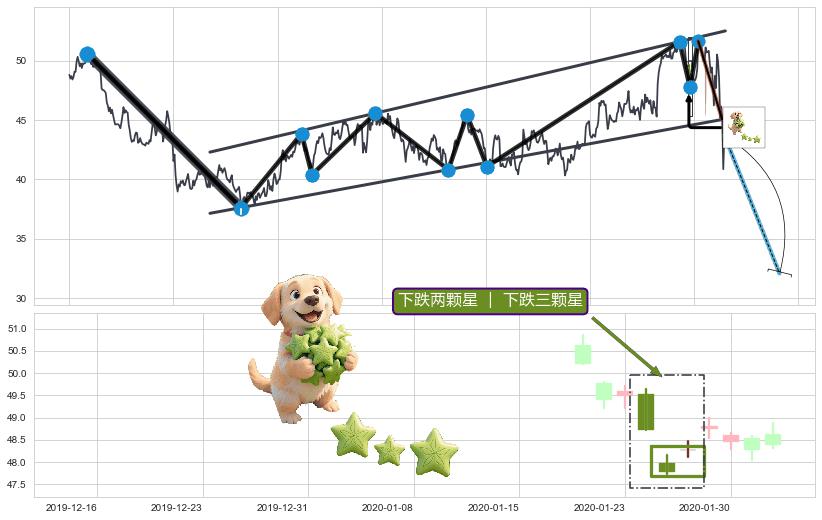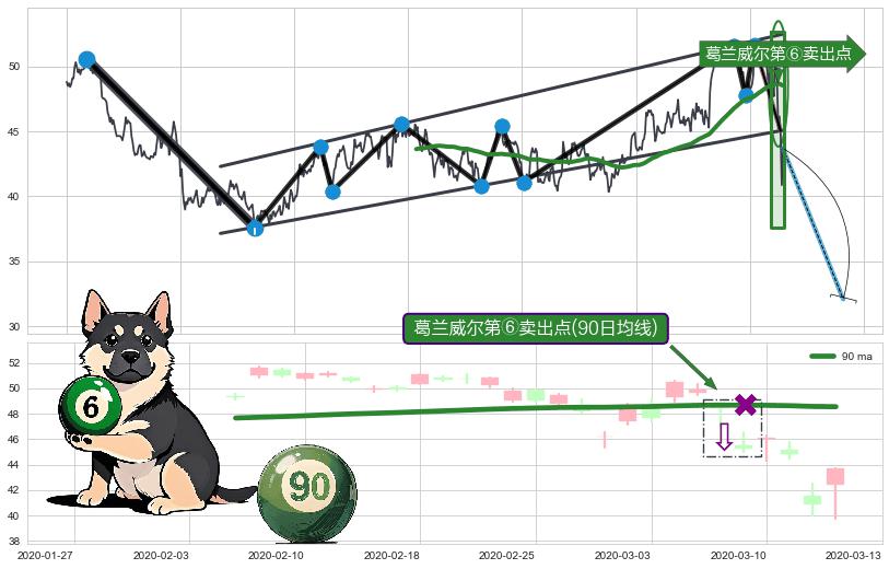 ➢ 收盘价(2020-03-13: 43.72 )→回踩→第二根k线高点(2020-03-12: 42.50 )
