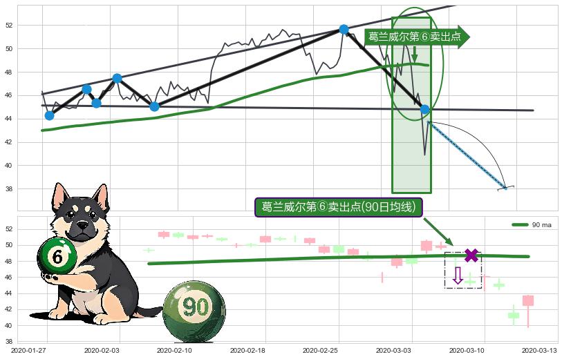 ➢ 收盘价(2020-03-13: 43.72 )→回踩→第二根k线高点(2020-03-12: 42.50 )