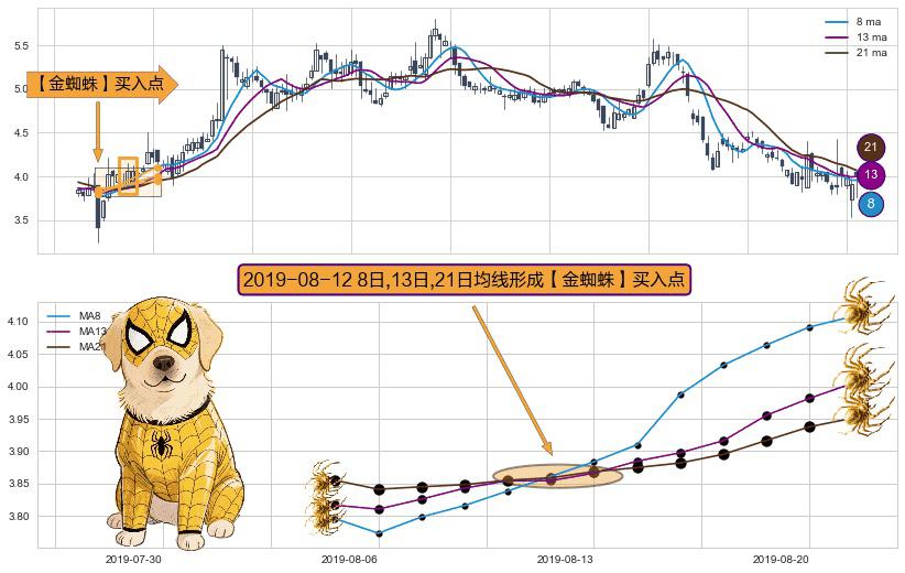 ⚀ 2019-08-12日显现 8日-13日-21日均线 【金蜘蛛】买入点 看多信号,后市看涨,买入