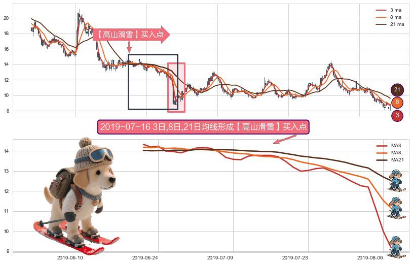 形态多维评估: ⚀ 2019-06-20日-2019-08-07日显现 3日-8日-21日均线 【高山滑雪】买入点 看多信号,后市看涨,买入