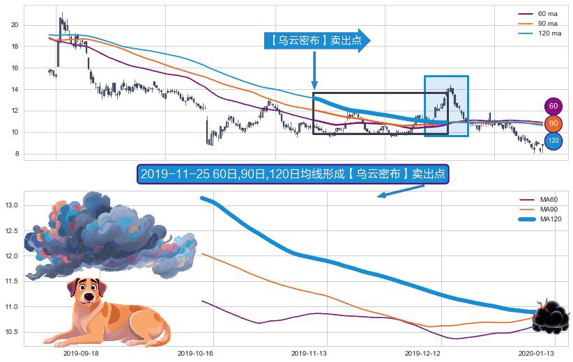 形态多维评估: ⚀ 2019-10-14日-2020-01-09日显现 60日-90日-120日均线 【乌云密布】卖出点 看空信号,后市看跌,卖出