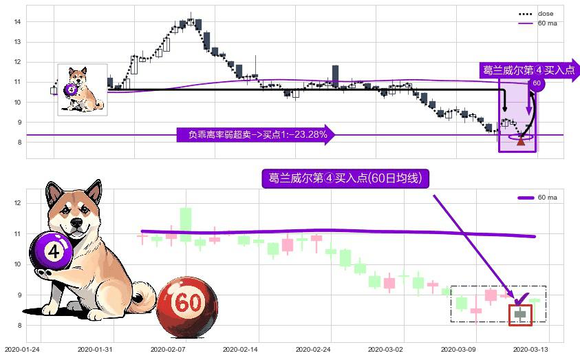 形态多维评估: ⚀ 2020-03-12-日显现 葛兰威尔均线 60日均线 第④买入点 下降趋势均值回复的短线反弹信号,后市看涨,买进信号