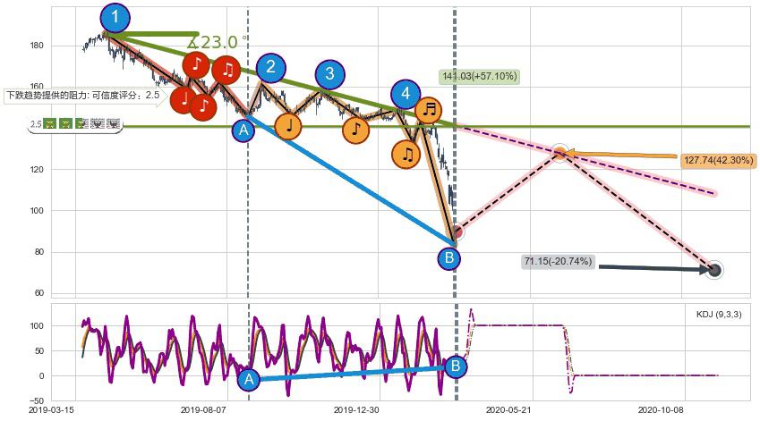 ♘ 在最后的下跌阶段2019-04-12至2020-03-13,存在 持续未破位的阻力位 ,阻力价格141.03,可信任强度67.42%,其距离最后价格89.77相差 +57.10%