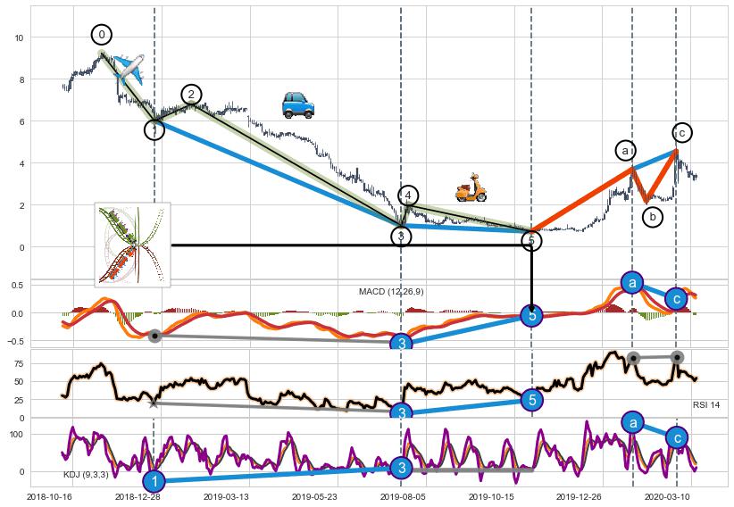 ➣ 1,3,5驱动浪MACD, RSI, KDJ走势都出现【常规背离】反转信号增强