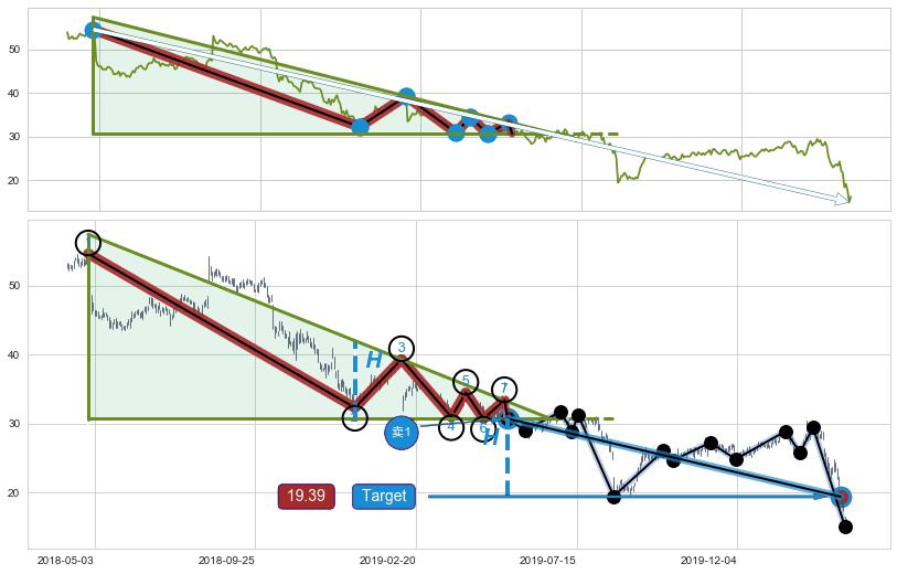 ➢ 【多方力量耗尽,空方打破攻守平衡点】下降三角形中继整理, 已在2019-05-13突破【支撑】颈线 30.70 →演变成下降通道