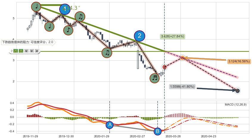 ♘ 在最后的下跌阶段2019-11-26至2020-03-13,存在 持续未破位的阻力位 ,阻力价格3.426,可信任强度65.77%,其距离最后价格2.680相差 +27.84%
