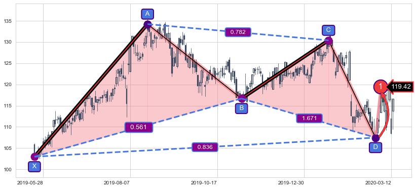 ➣ 未完成【蝙蝠】形态起点X: 2019-04-25, 已到达C点: 2020-01-21, 预测最终D点: 2020-08-14, 共324交易日