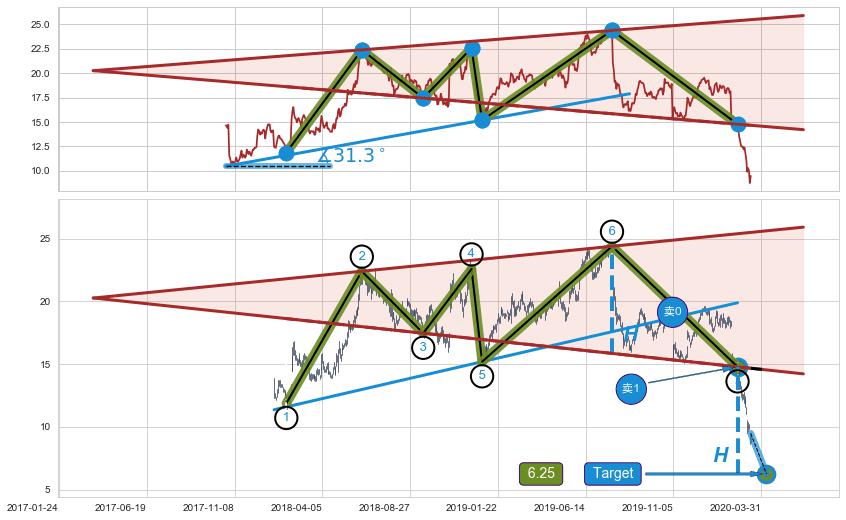 ➢ 最小反转跌幅→𝐇: 8.54 (逐步抬高阻力斜边最后的阻力点⑥与支撑边垂直距离)