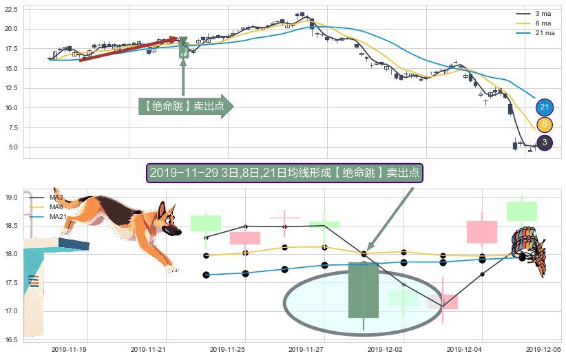 ⚀ 2019-11-29日显现 3日-8日-21日均线 【绝命跳】卖出点 看空信号,后市看跌,卖出
