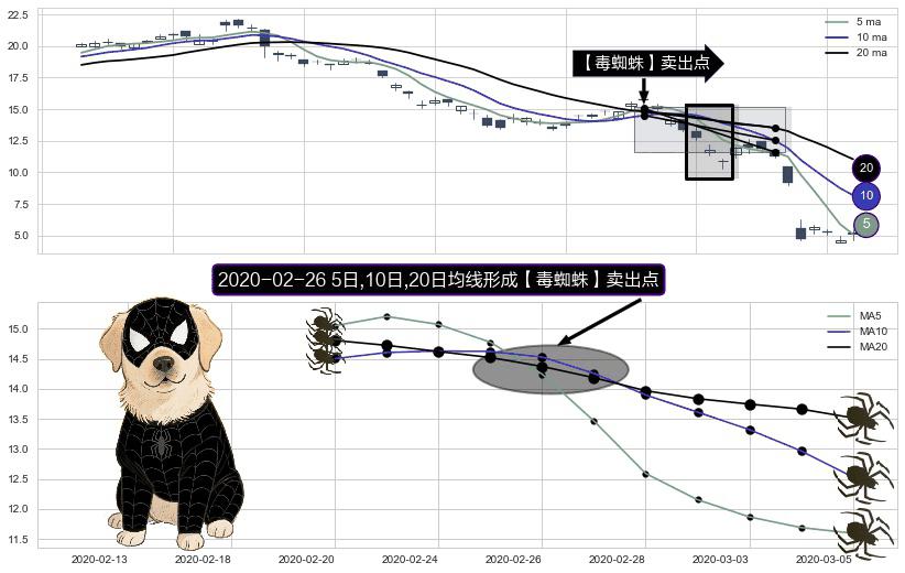 ⚀ 2020-02-26日显现 5日-10日-20日均线 【毒蜘蛛】卖出点 看空信号,后市看跌,卖出