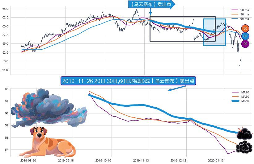 ⚀ 2019-09-30日-2020-01-27日显现 20日-30日-60日均线 【乌云密布】卖出点 看空信号,后市看跌,卖出