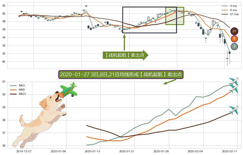 ⚀ 2020-01-09日-2020-02-10日显现 3日-8日-21日均线 【战机起航】卖出点 看空信号,后市看跌,卖出