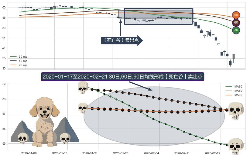 ⚂ 【死亡谷】卖出点 由MA30均线下穿MA60均线和MA90均线,MA60均线下穿MA90均线形成