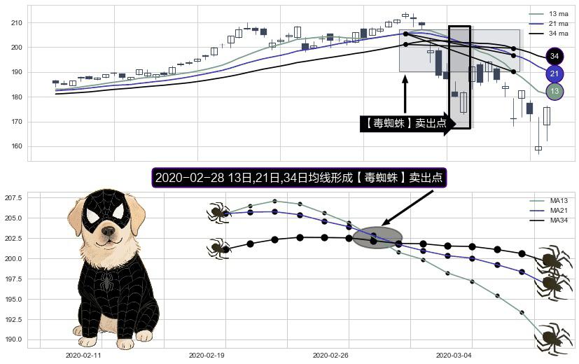 ⚀ 2020-02-28日显现 13日-21日-34日均线 【毒蜘蛛】卖出点 看空信号,后市看跌,卖出