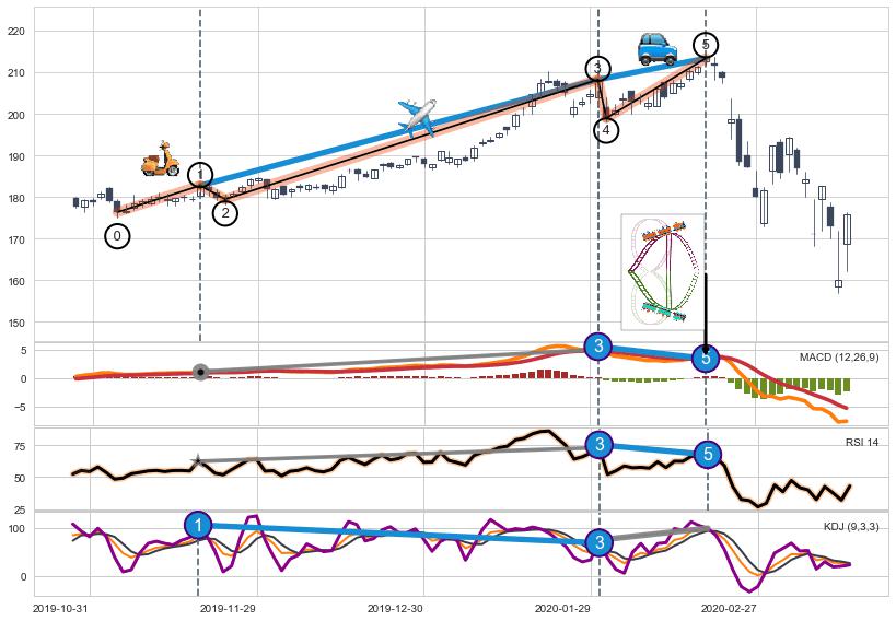 ➢ 1,3,5驱动浪MACD, RSI, KDJ走势都出现【常规背离】反转信号增强