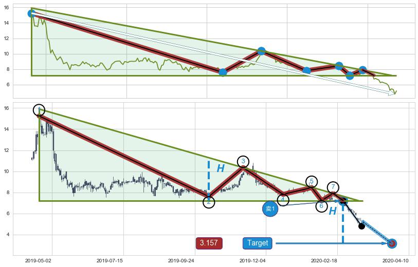 ➢ 【多方力量耗尽,空方打破攻守平衡点】下降三角形中继整理, 已在2020-02-24突破【支撑】颈线 7.22 →演变成下降通道