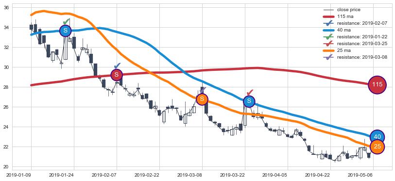下跌趋势2019-01-09-2019-05-06,均线40, 25, 115确认关键阻力4处