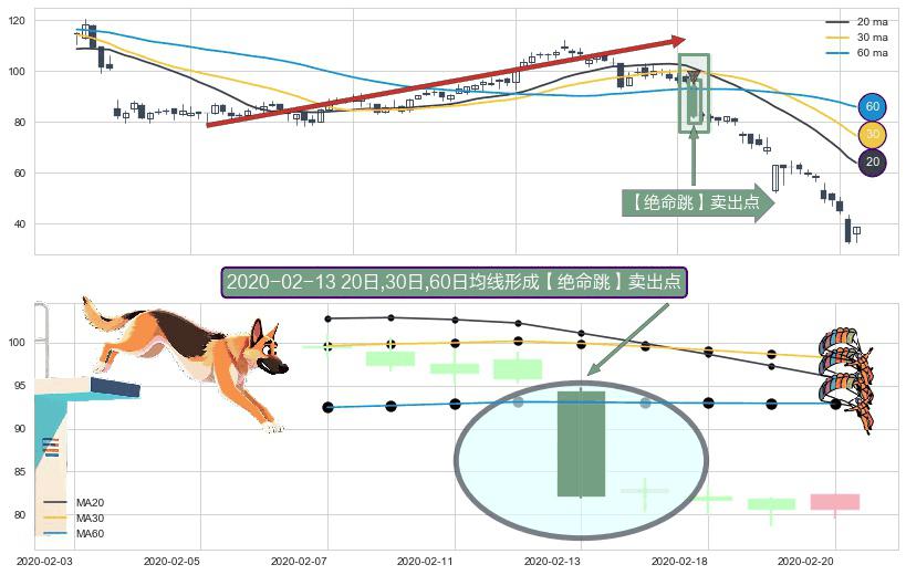形态多维评估: ⚀ 2020-02-13日显现 20日-30日-60日均线 【绝命跳】卖出点 看空信号,后市看跌,卖出