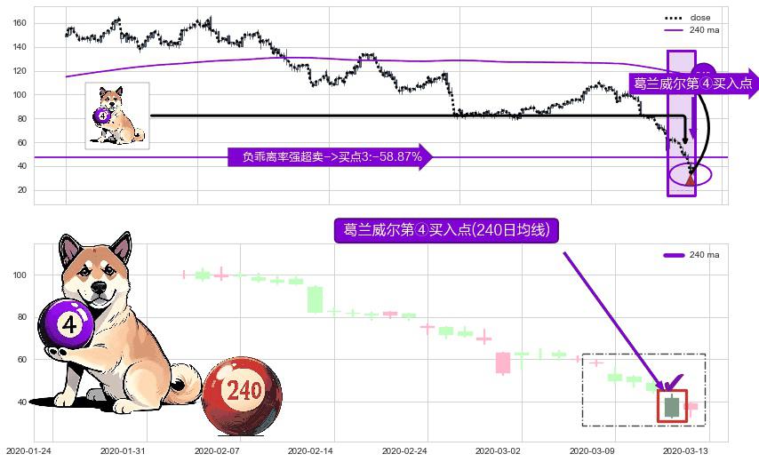 形态多维评估: ⚀ 2020-03-12-日显现 葛兰威尔均线 240日均线 第④买入点 下降趋势均值回复的短线反弹信号,后市看涨,买进信号