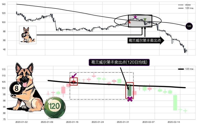形态多维评估: ⚀ 2020-01-31-日显现 葛兰威尔均线 120日均线 第⑧卖出点 下降趋势的中继信号,后市看跌,卖出信号