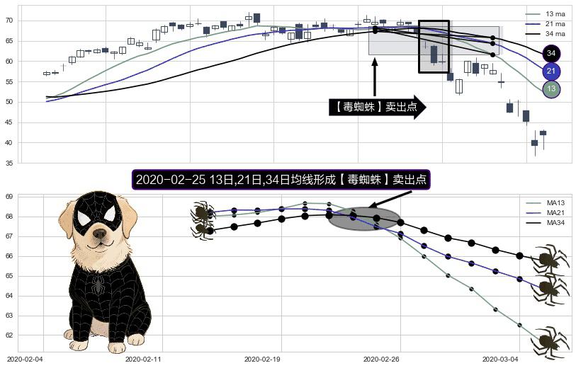 ⚀ 2020-02-25日显现 13日-21日-34日均线 【毒蜘蛛】卖出点 看空信号,后市看跌,卖出