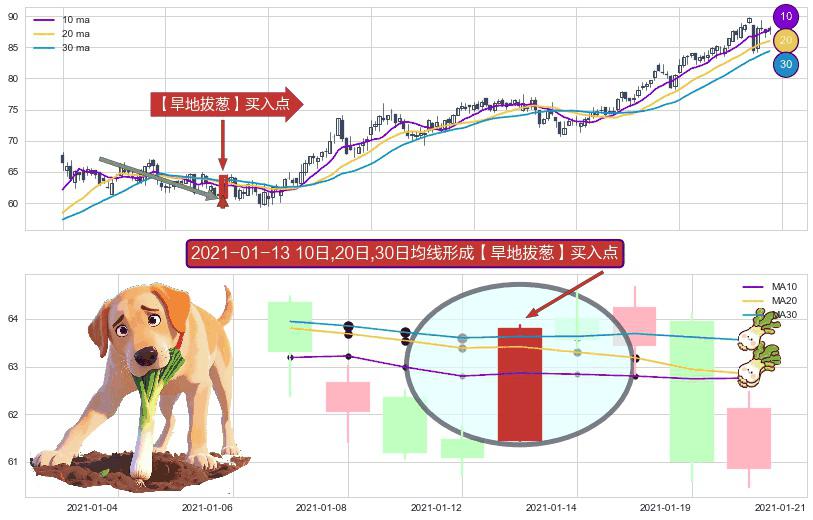 形态多维评估: ⚀ 2021-01-13日显现 10日-20日-30日均线 【旱地拔葱】买入点 看多信号,后市看涨,买入