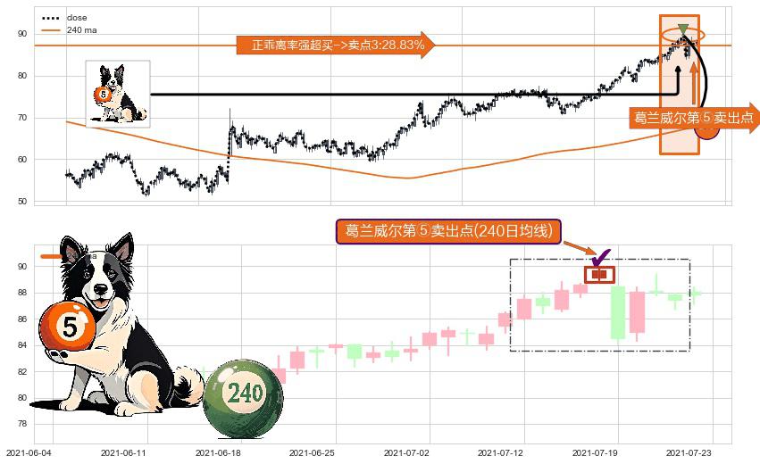 形态多维评估: ⚀ 2021-07-16-日显现 葛兰威尔均线 240日均线 第⑤卖出点 上升趋势均值回复的短线回落信号,后市看跌,卖出信号