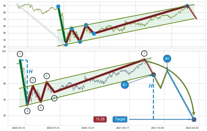 ➣ 最小中继整理跌幅→𝐇: 55.75 (𝐇旗杆的长度:旗杆起点→顶点)