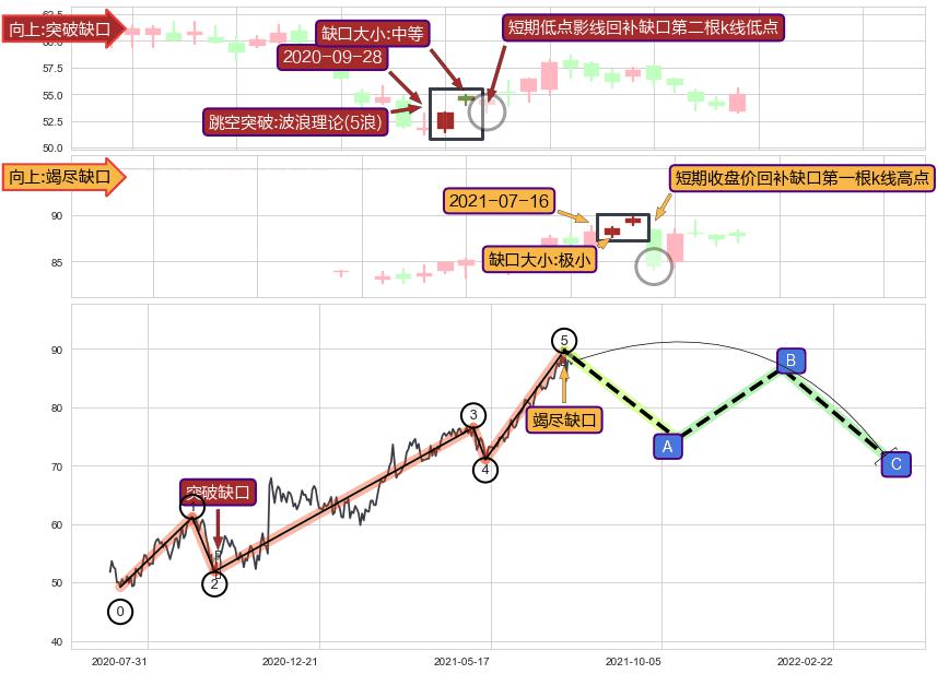 ➣ 突破缺口形成后,后续k不足7根,跳空突破波浪理论(5浪)关键点后, 出现【轻微回踩】迹象,短期高点影线回补缺口第二根k线高点