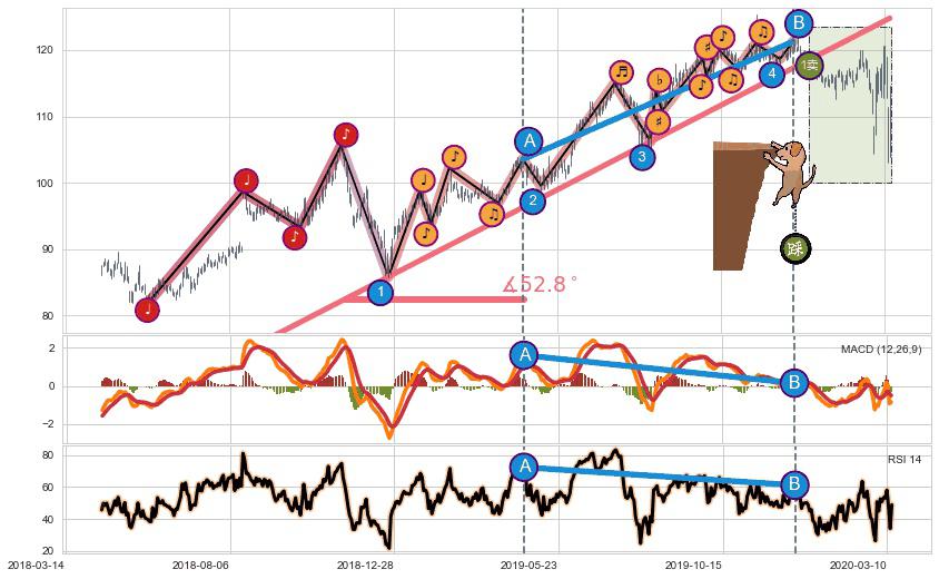➣ 【MACD】上升趋势出现【常规背离 & 反转信号】背离程度44.14%,背离夹角角度68.4˚,背离程度较大