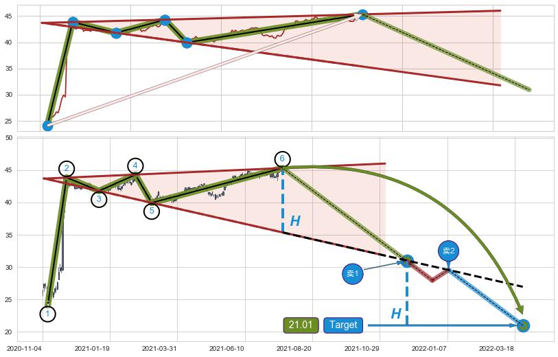 ➢ 最小反转跌幅→𝐇: 9.94 (逐步抬高阻力斜边最后的阻力点⑥与支撑边垂直距离)