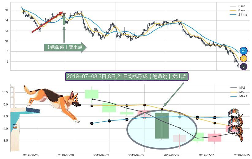 形态多维评估: ⚀ 2019-07-08日显现 3日-8日-21日均线 【绝命跳】卖出点 看空信号,后市看跌,卖出
