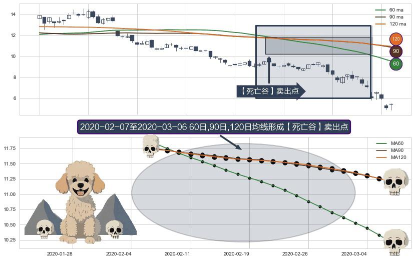 ⚂ 【死亡谷】卖出点 由MA60均线下穿MA90均线和MA120均线,MA90均线下穿MA120均线形成