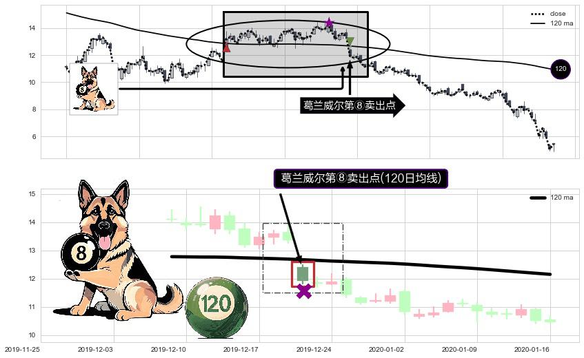 形态多维评估: ⚀ 2019-12-20-日显现 葛兰威尔均线 120日均线 第⑧卖出点 下降趋势的中继信号,后市看跌,卖出信号