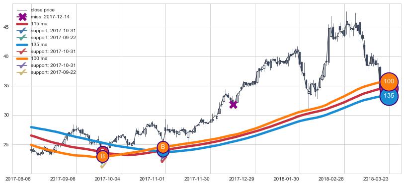 上涨趋势2017-08-08-2018-03-23,均线115, 100, 135确认关键支撑2处