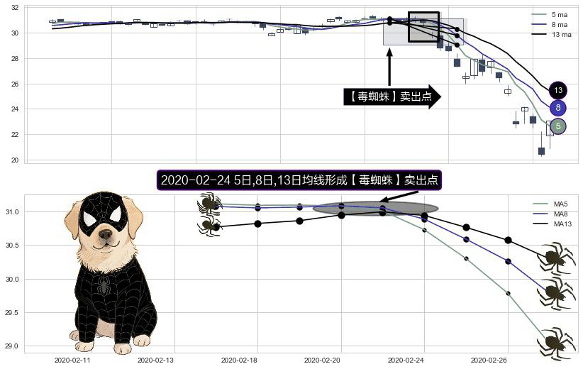 ⚀ 2020-02-24日显现 5日-8日-13日均线 【毒蜘蛛】卖出点 看空信号,后市看跌,卖出