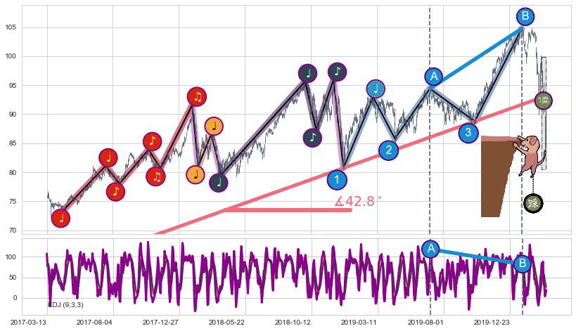 ➢ 上升趋势【顶点B】比【顶点A】高⤴️,【KDJ】指标【顶点B】比【顶点A】低⤵️