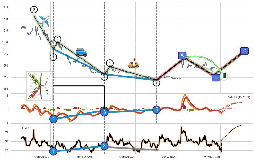 ➣ 第一, 三, 五浪下跌动能逐渐【衰弱变小】,趋势呈现不稳迹象