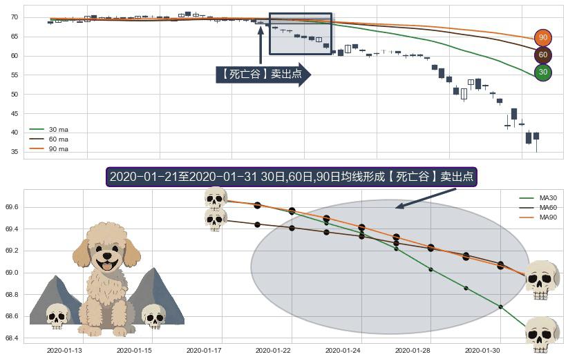 ⚂ 【死亡谷】卖出点 由MA30均线下穿MA60均线和MA90均线,MA60均线下穿MA90均线形成