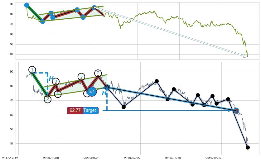 ➢ 【多方力量耗尽,空方打破攻守平衡点】下降三角形中继整理, 已在2020-01-27突破【支撑】颈线 65.51 →演变成下降通道