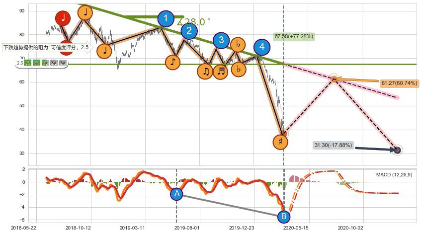 ♘ 在最后的下跌阶段2018-07-26至2020-03-13,存在 持续未破位的阻力位 ,阻力价格67.58,可信任强度67.96%,其距离最后价格38.12相差 +77.28%
